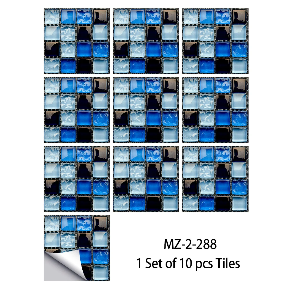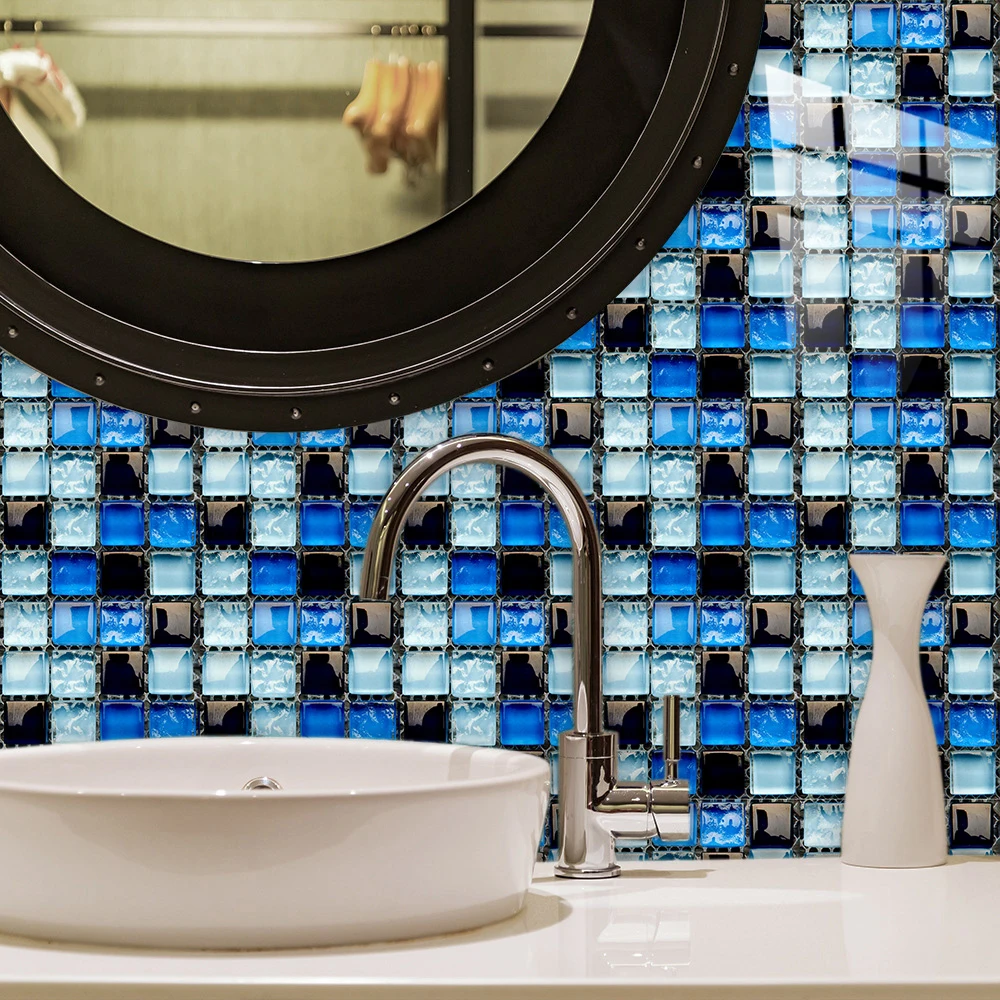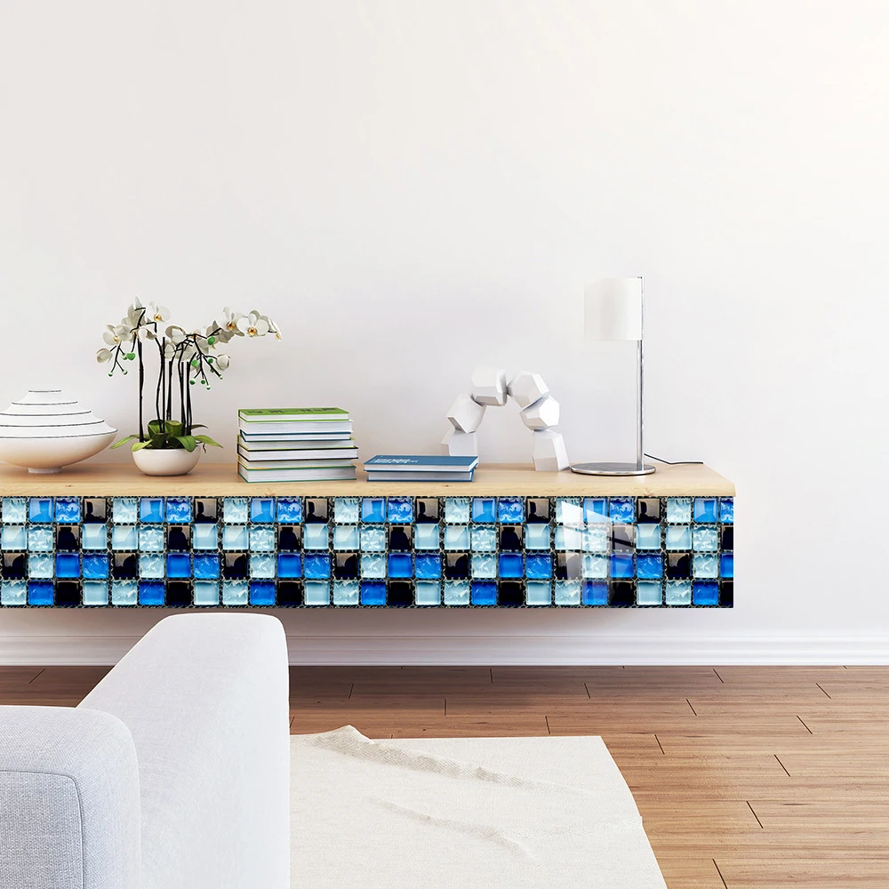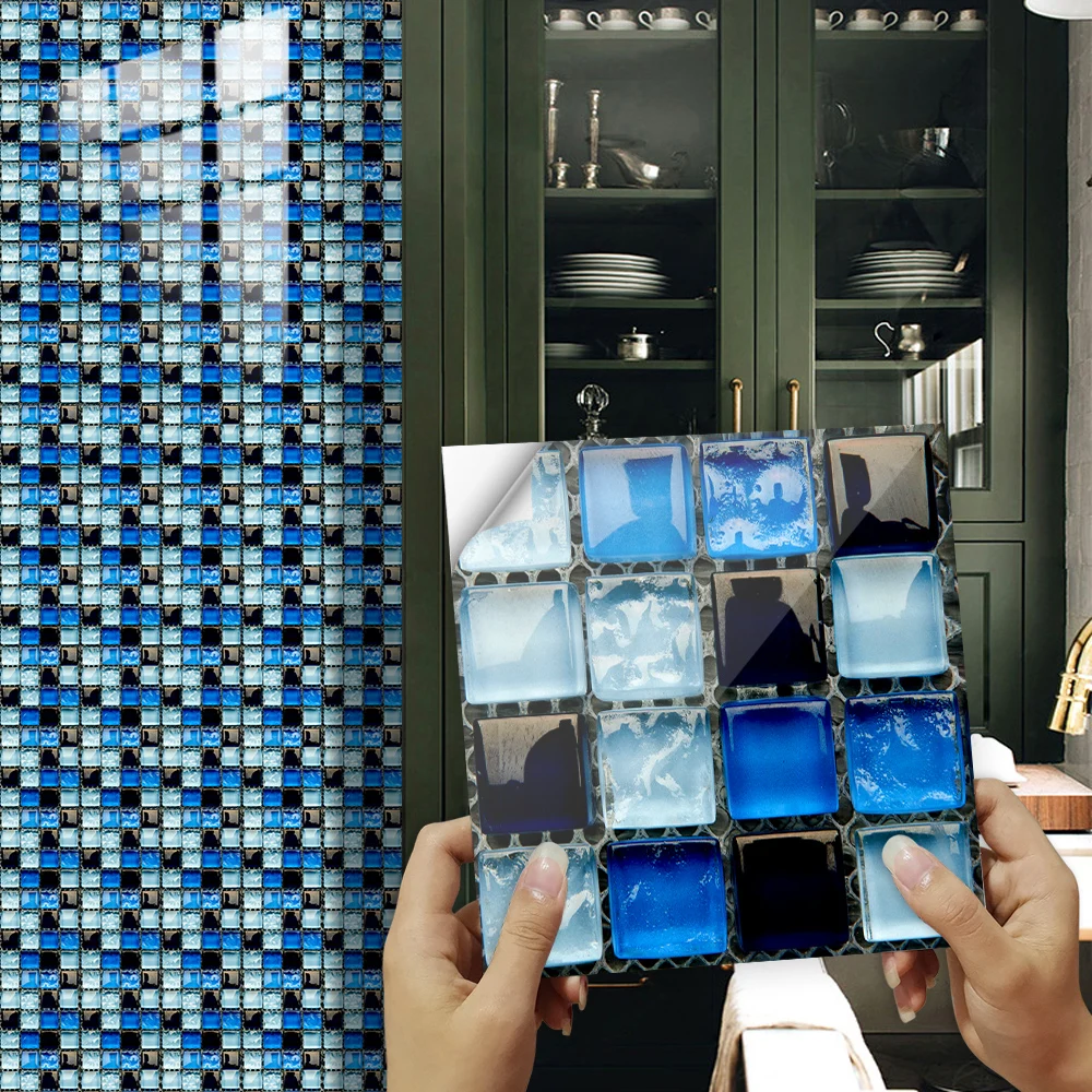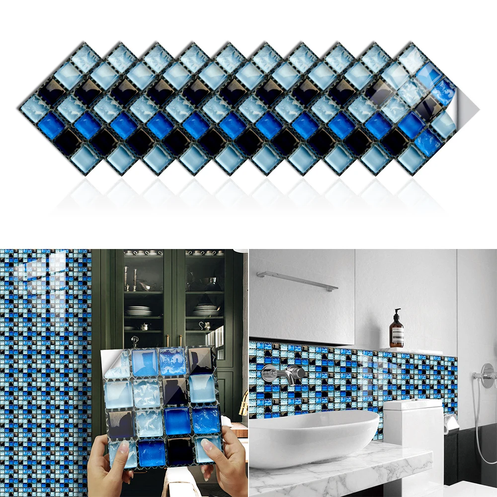 10 pçs/set Liso Azul Filme Duro de Cristal Mosaico Azulejos Etiqueta Living Room Decor Wall Stickers Peel & Vara Removível PVC Papel De Parede