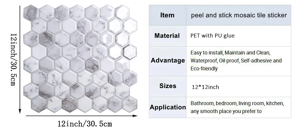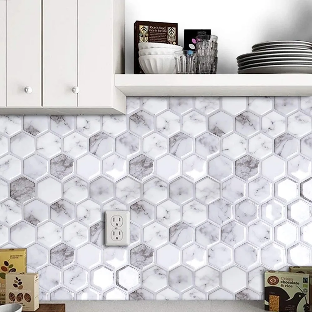 Adesivo de vinil hexágono com textura de pedra branca, papel de parede autoadesivo, azulejos quadrados para cozinha e banheiro (1 folha) R$26,32