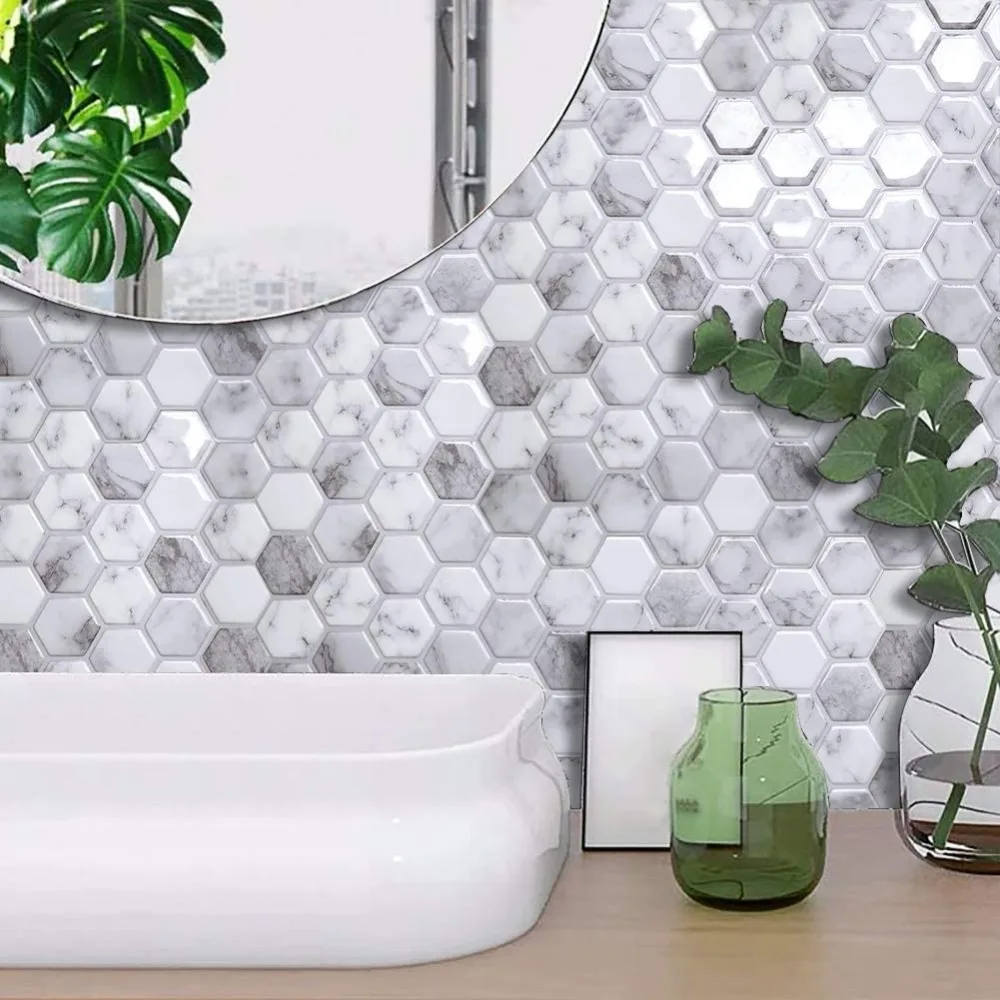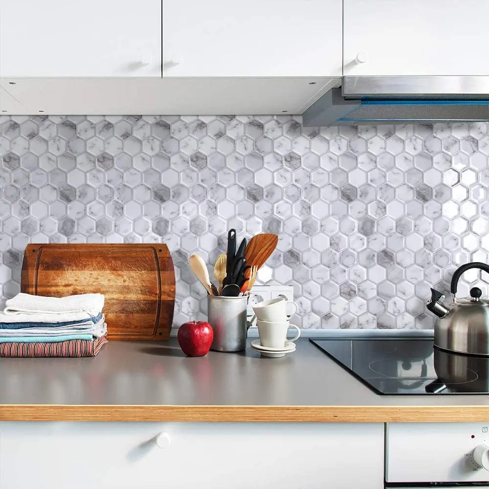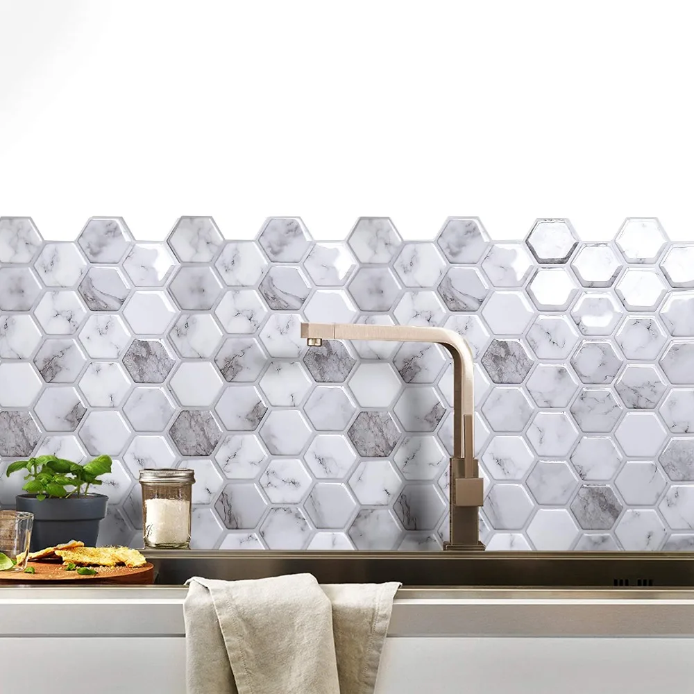 Adesivo de vinil hexágono com textura de pedra branca, papel de parede autoadesivo, azulejos quadrados para cozinha e banheiro (1 folha)