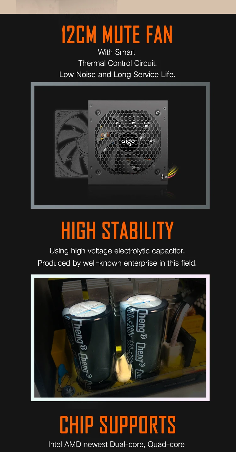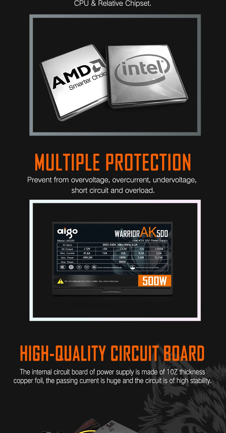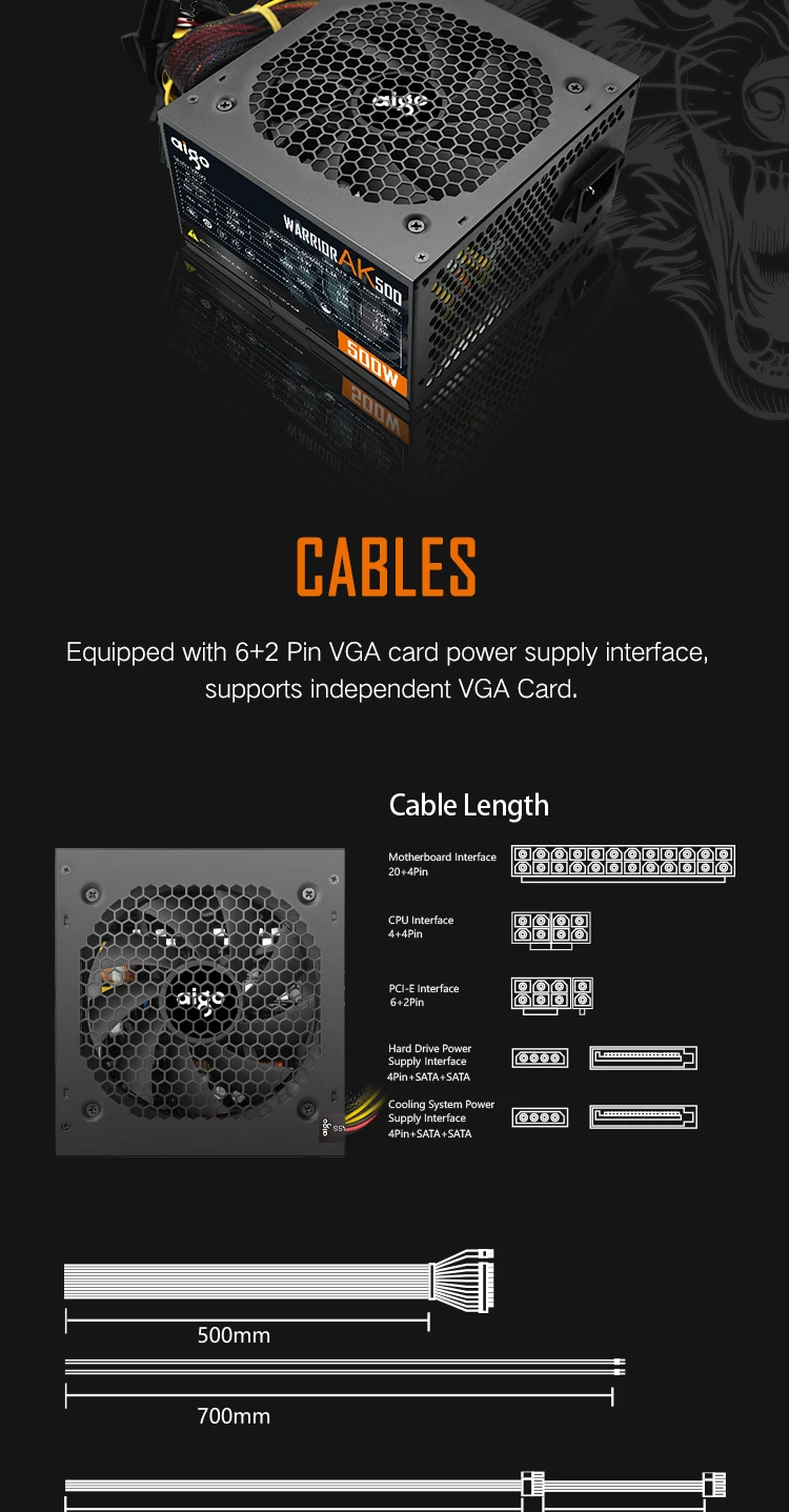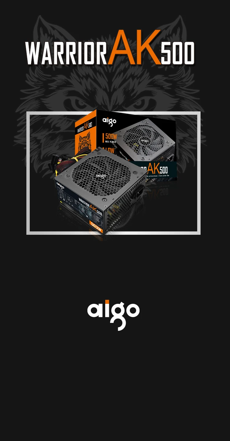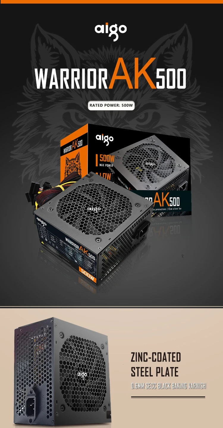 Aigo-AK Fonte de Alimentação para PC, Black Gaming, Quiet, 120mm, RGB Fan, 24P