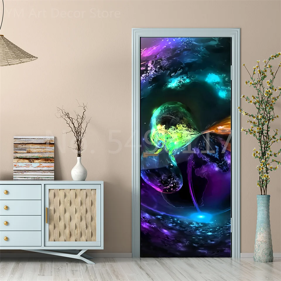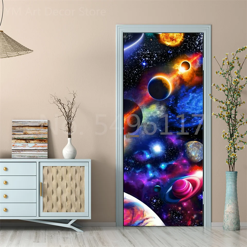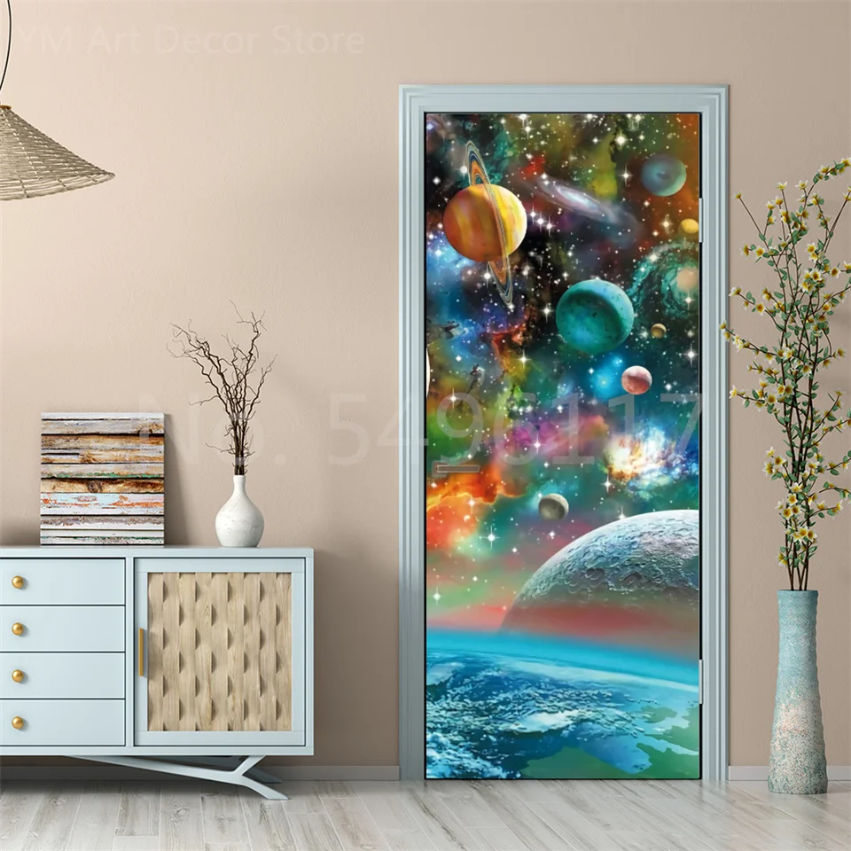 Astronauta Adesivo de porta Lua Terra Planeta Espaço porta Papéis de parede Adesivo de parede 3D Peel and Stick Vinil Quarto sala de estar Decoração Poster DIY Móveis geladeira porta adesivos