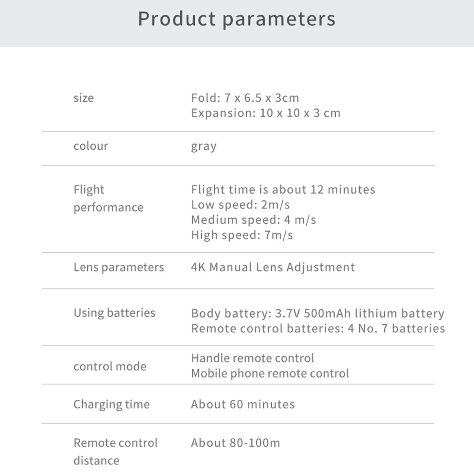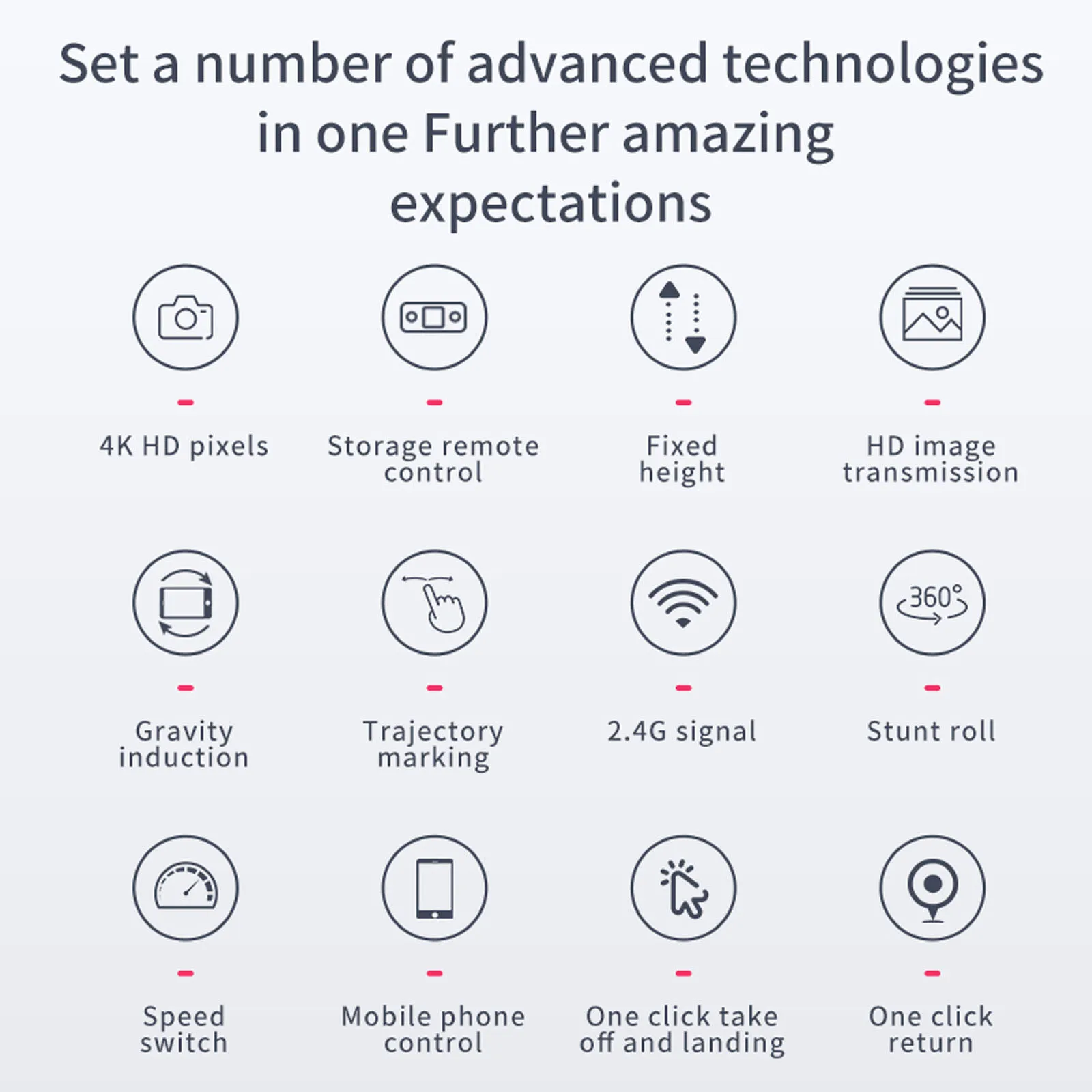 -Braços dobráveis, compactos e fáceis de transportar. -Função de modo de retenção em altitude, voo estável. -No modo headless, não há necessidade de ajustar a posição da aeronave antes de voar. -Use a função de retorno de uma tecla para encontrar facilmente o caminho de casa. -Câmera de alta definição de 4k pixels. Surpreendentemente, pode capturar imagens e vídeos impressionantes do céu. -Com a função wi-fi, você pode se conectar ao aplicativo, sistema apk e tirar fotos, vídeos e transmissão em tempo real através da imagem da câmera do telefone. -Desenhe o caminho de voo na tela e o drone voará autônomo ao longo do caminho especificado. -Tecnologia anti-jamming de 2.4ghz. -4 canais de subida, descida, para frente, para trás, voar à esquerda, direita e 360 ° -Giroscópio de seis eixos, o vôo é mais estável e o controle é mais conveniente. -As luzes led tornam o voo mais espetacular, especialmente no escuro.