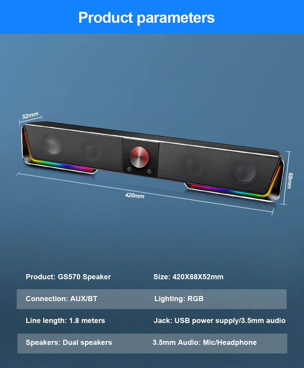 A barra de som do redragon embala proeza audio com os motoristas duplos finamente ajustados de 1.5w para trazer o som à vida para uma experiência de áudio fantasticamente dinâmica apoio bt e entrada aux rgb iluminação, facilmente ligar/desligar a luz ou mudar a cor Modo com o botão de toque na conexão com fio superior a outros dispositivos através do cabo aux de 3.5mm notavelmente o alto-falante compacto do computador é magro o suficiente para sentar-se abaixo monitores lisos para economizar espaço mantenha sua desordem da mesa Livre