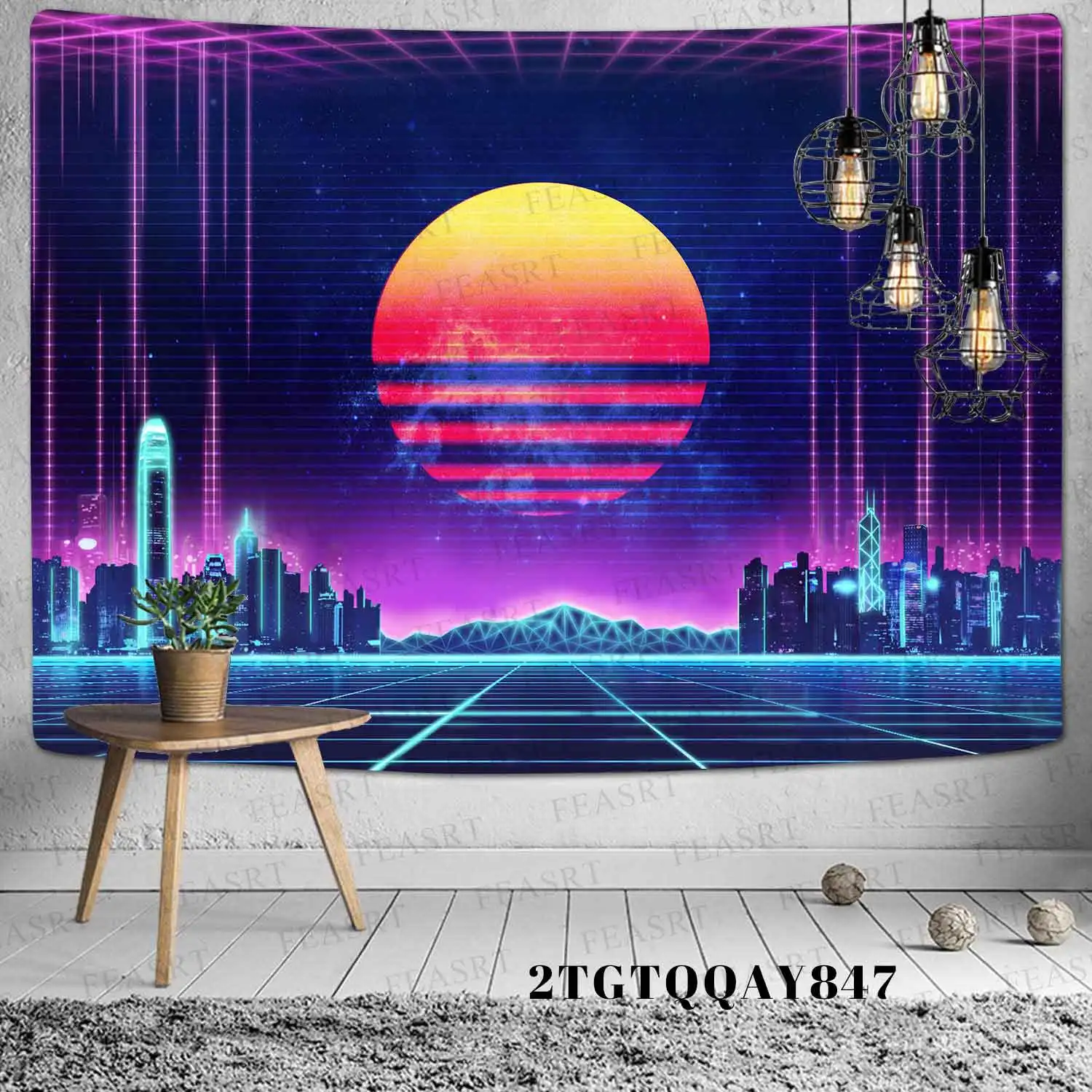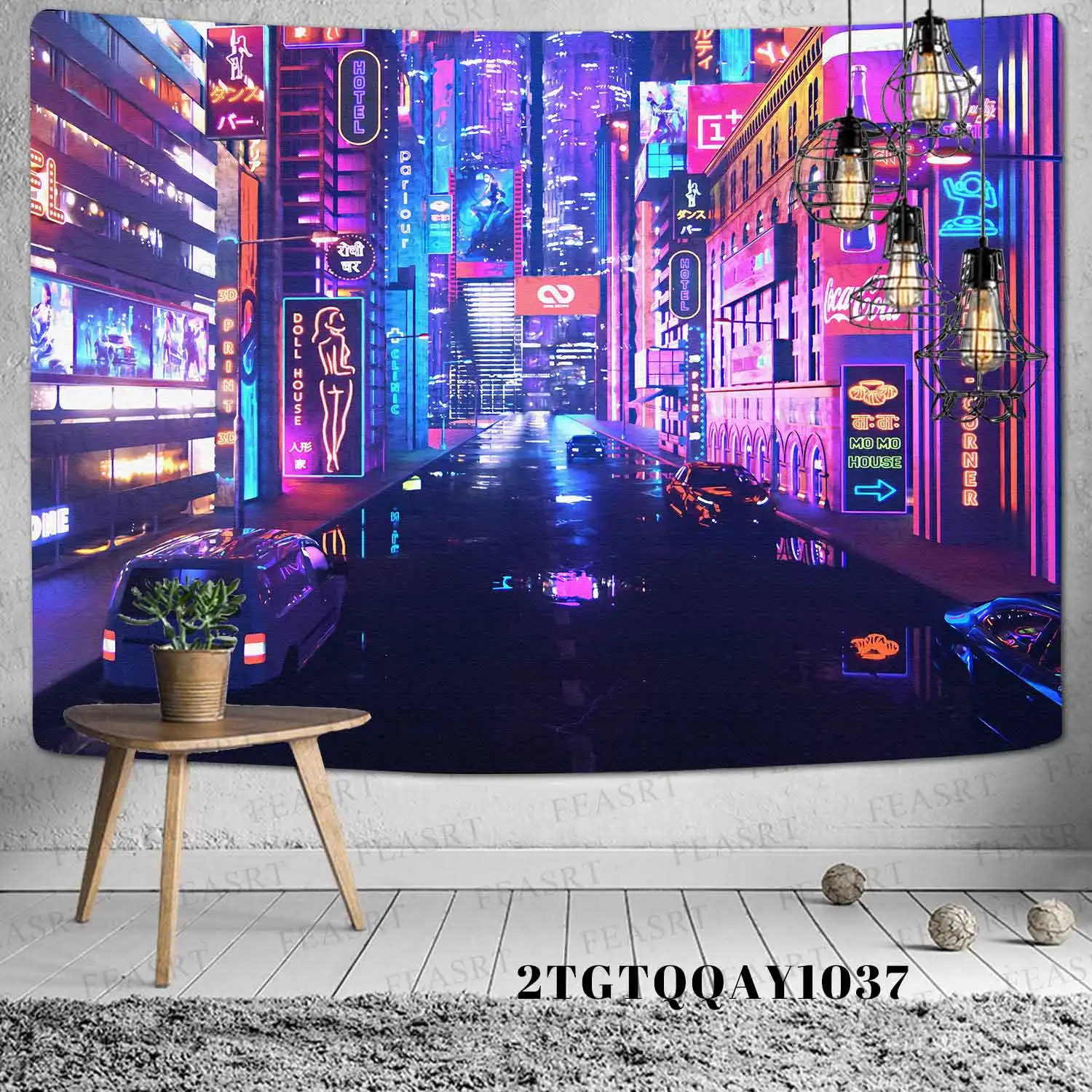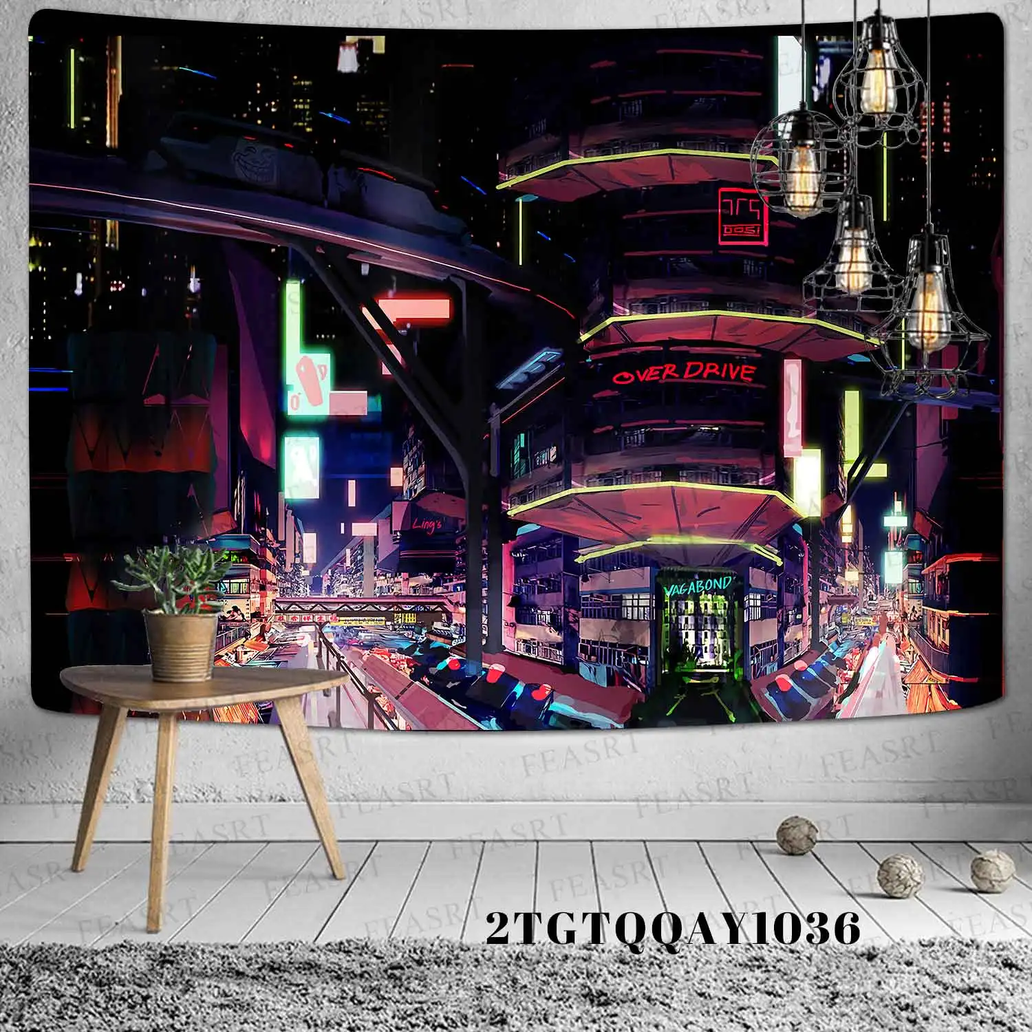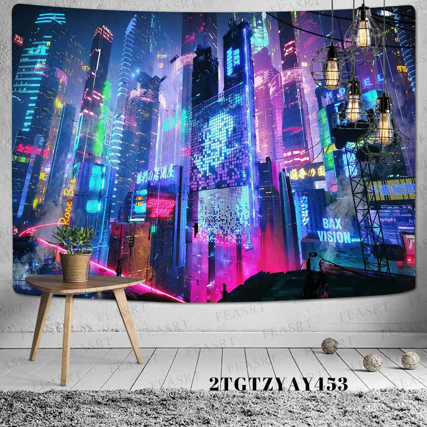 Siming tapeçaria de ciberespaço cibernético, tapeçaria punk psicodélico da cidade do futuro, tapeçaria de cidade neon